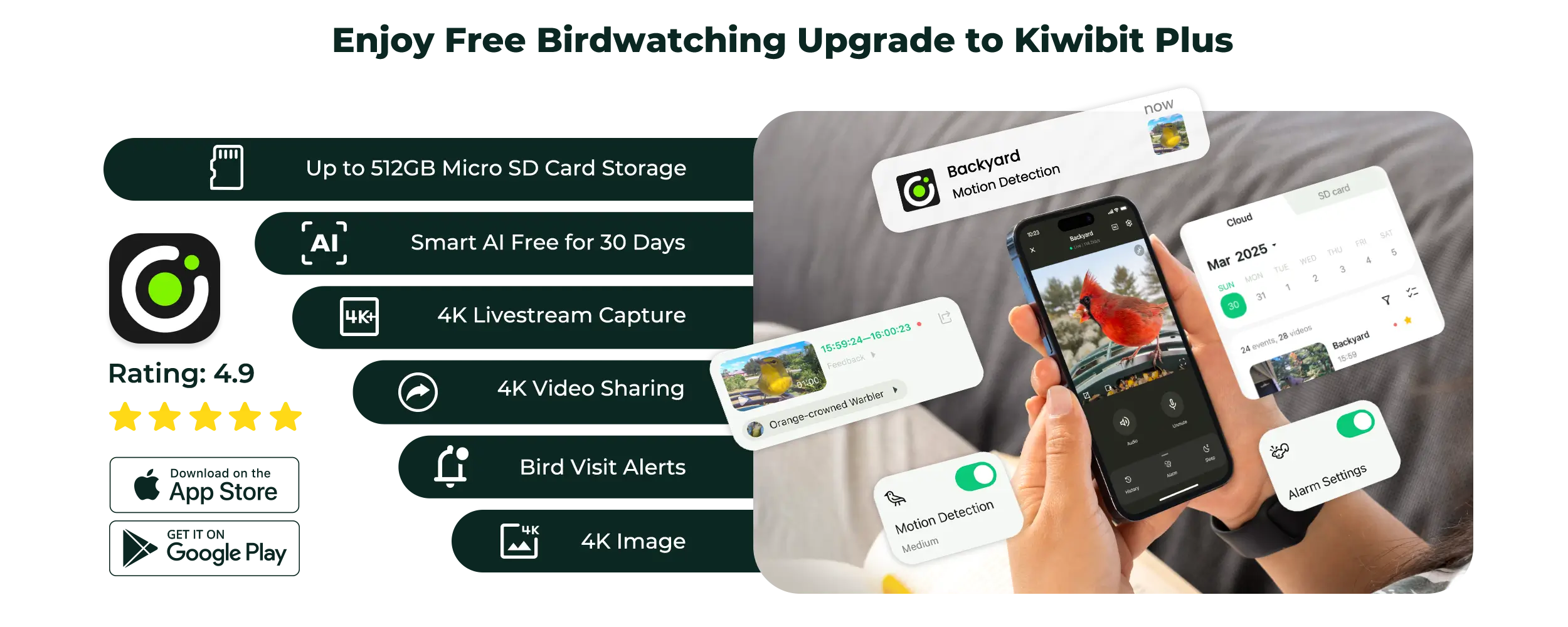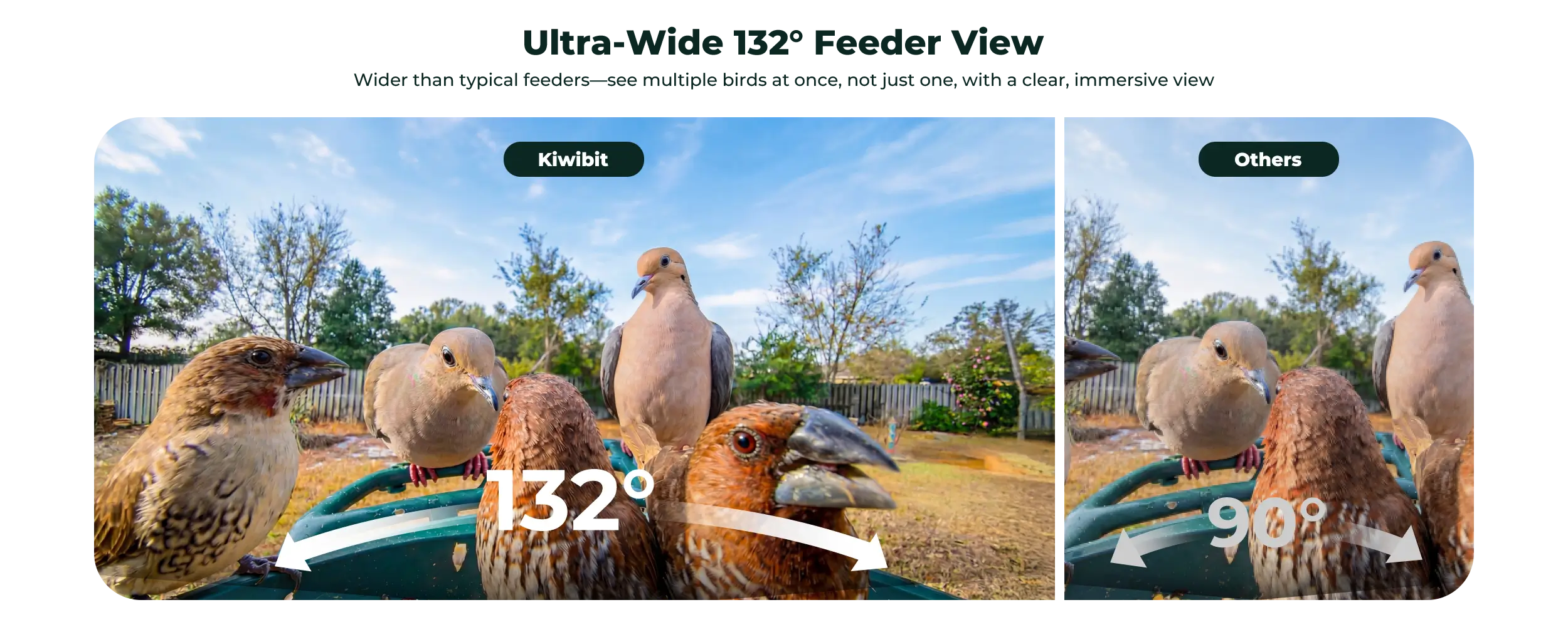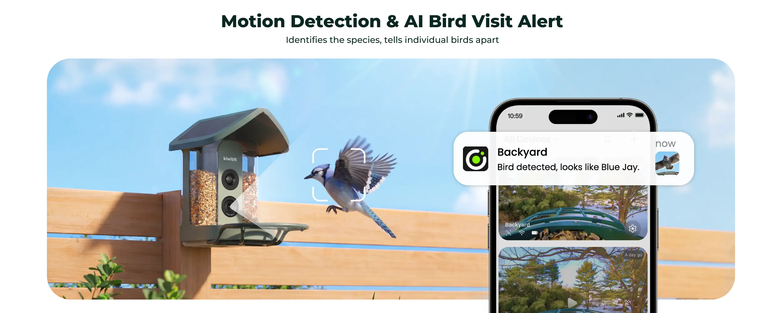 The Kiwibit Bird Feeder 2 works with the Kiwibit app to identify over 10,000 bird species using proprietary AI technology. You receive real-time alerts when birds visit and can access visit summaries and auto-captured KeyShot galleries.