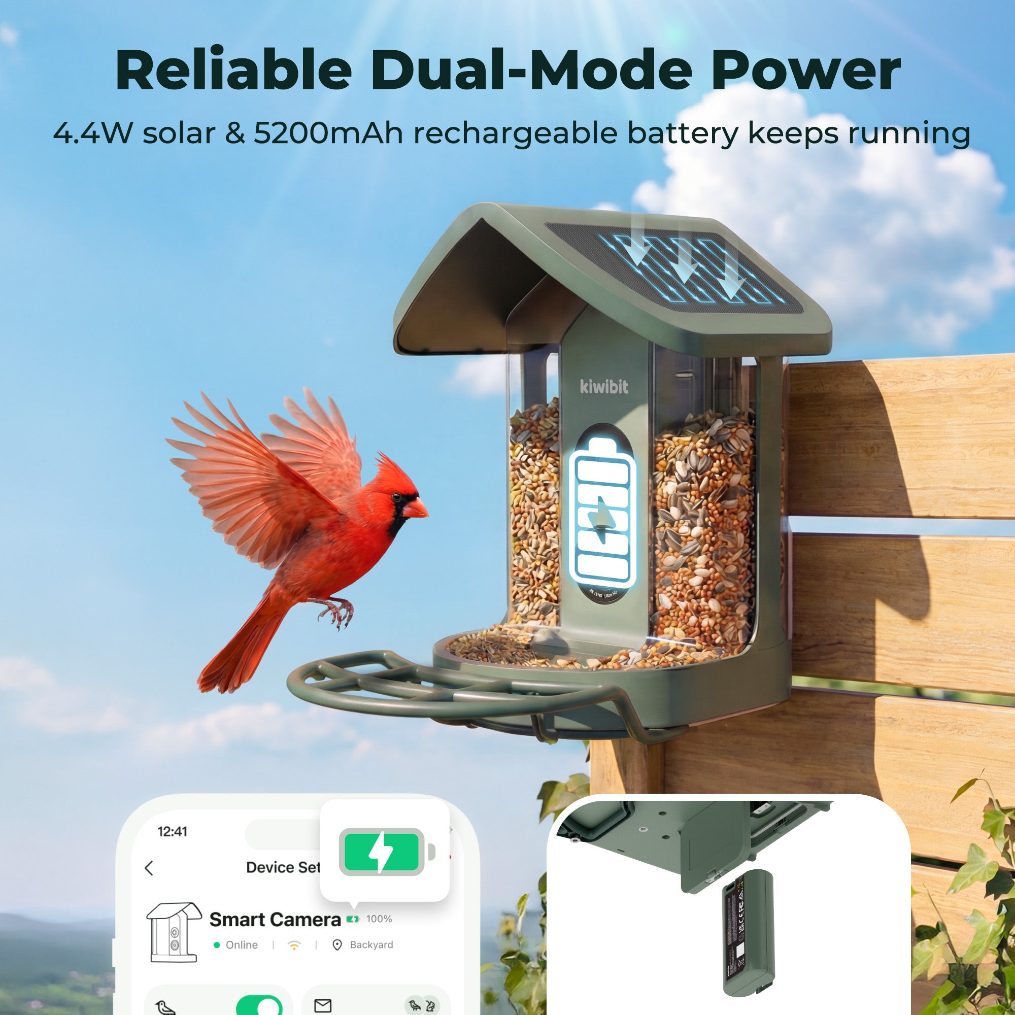 Yes. The Kiwibit Bird Feeder 2 features dual integrated solar panels paired with a rechargeable removable battery. The solar panels continuously harness sunlight during the day to help power the device and reduce the need for frequent manual charging.