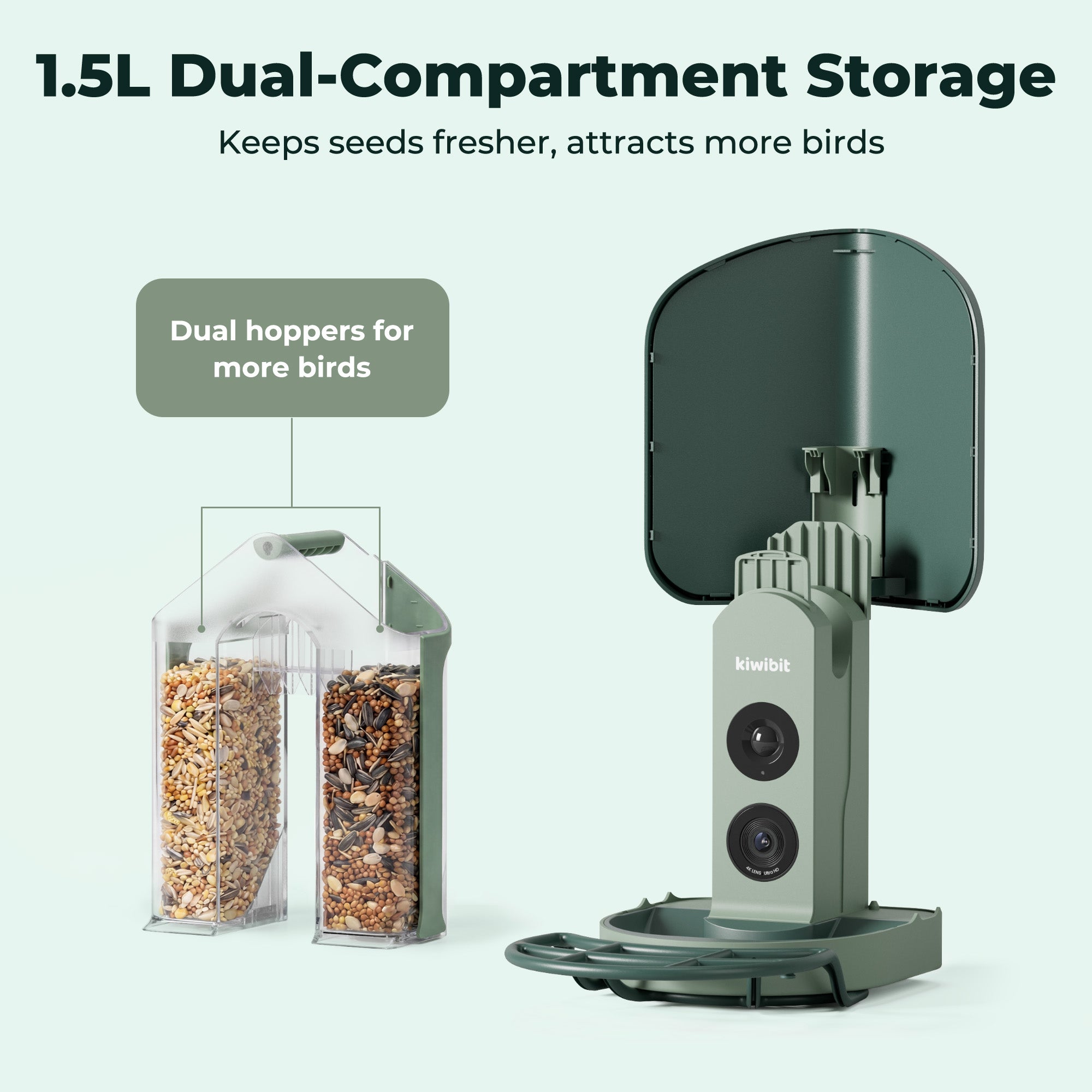 The 1.5L detachable dual-seed hopper allows easy cleaning and refilling. Simply remove, rinse, and refill to maintain a healthy feeding environment.